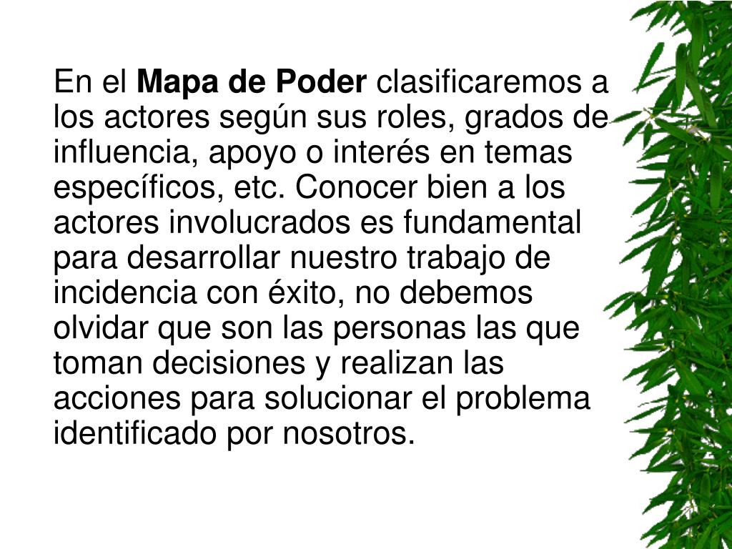En el Mapa de Poder clasificaremos a los actores según sus roles, grados de influencia, apoyo o interés en temas específicos, etc. Conocer bien a los actores involucrados es fundamental para desarrollar nuestro trabajo de incidencia con éxito, no debemos olvidar que son las personas las que toman decisiones y realizan las acciones para solucionar el problema identificado por nosotros.
