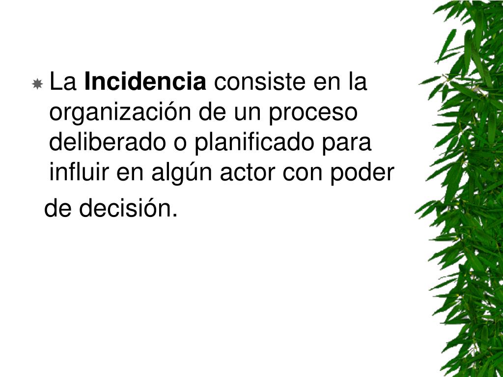 LA INCIDENCIA POLITICA. La Incidencia consiste en la organización de un proceso deliberado o planificado para influir en algún actor con poder de decisión.