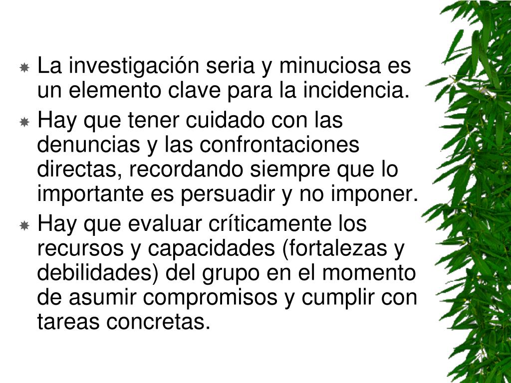 La investigación seria y minuciosa es un elemento clave para la incidencia. • Hay que tener cuidado con las denuncias y las confrontaciones directas, recordando siempre que lo importante es persuadir y no imponer. • Hay que evaluar críticamente los recursos y capacidades (fortalezas y debilidades) del grupo en el momento de asumir compromisos y cumplir con tareas concretas.