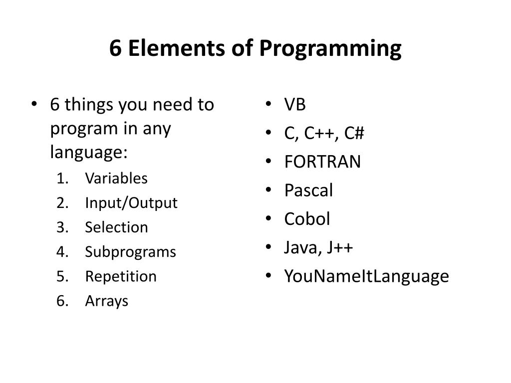 6 Elements of Programming • 6 things you need to program in any language: • Variables • Input/Output • Selection • Subprograms • Repetition • Arrays • VB • C, C++, C# • FORTRAN • Pascal • Cobol • Java, J++ • YouNameItLanguage