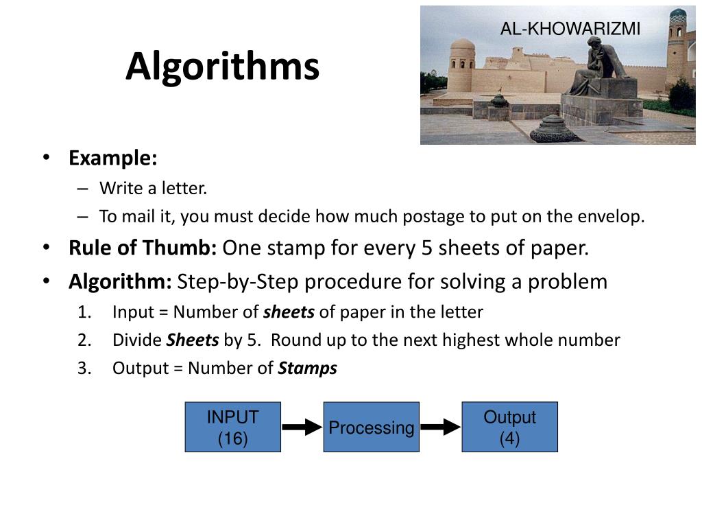 AL-KHOWARIZMI Output (4) INPUT (16) Processing Algorithms • Example: • Write a letter. • To mail it, you must decide how much postage to put on the envelop. • Rule of Thumb: One stamp for every 5 sheets of paper. • Algorithm: Step-by-Step procedure for solving a problem • Input = Number of sheets of paper in the letter • Divide Sheets by 5. Round up to the next highest whole number • Output = Number of Stamps