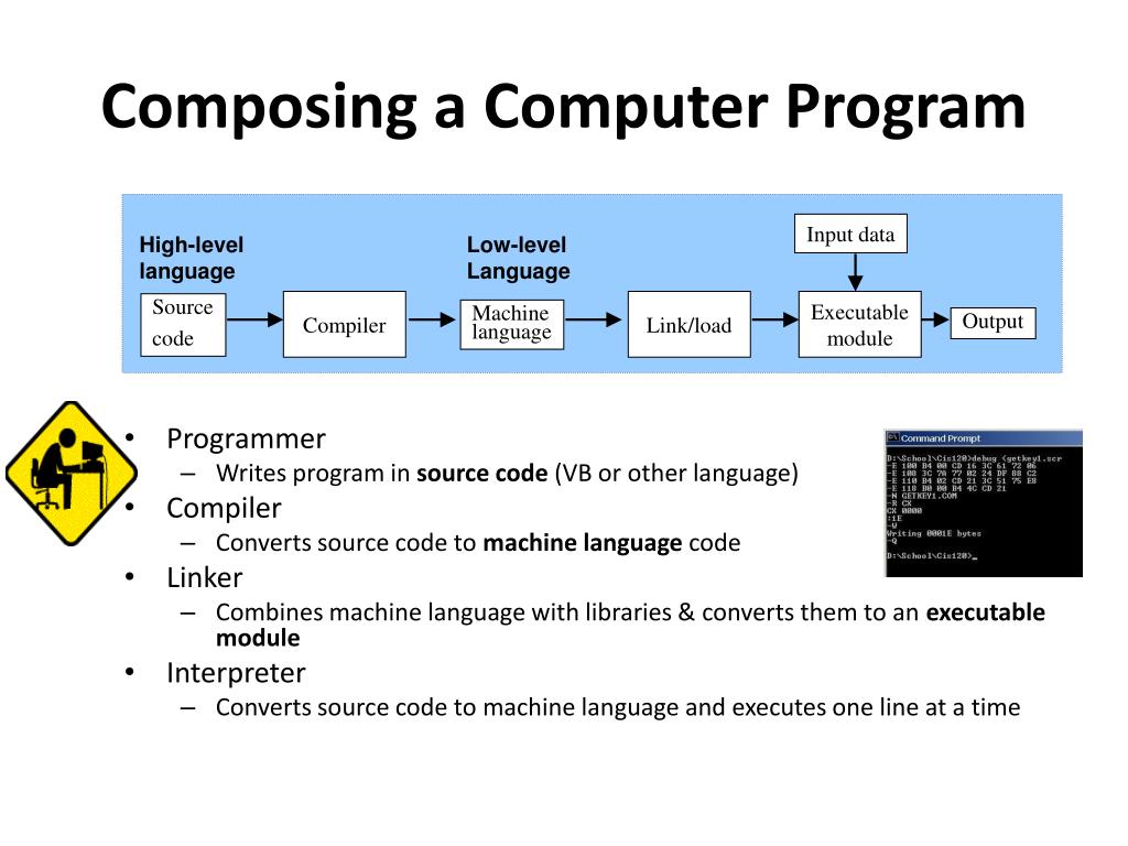 Input data High-level language Low-level Language Compiler Link/load Executablemodule Source code Machine language Output Composing a Computer Program • Programmer • Writes program in source code (VB or other language) • Compiler • Converts source code to machine language code • Linker • Combines machine language with libraries & converts them to an executablemodule • Interpreter • Converts source code to machine language and executes one line at a time
