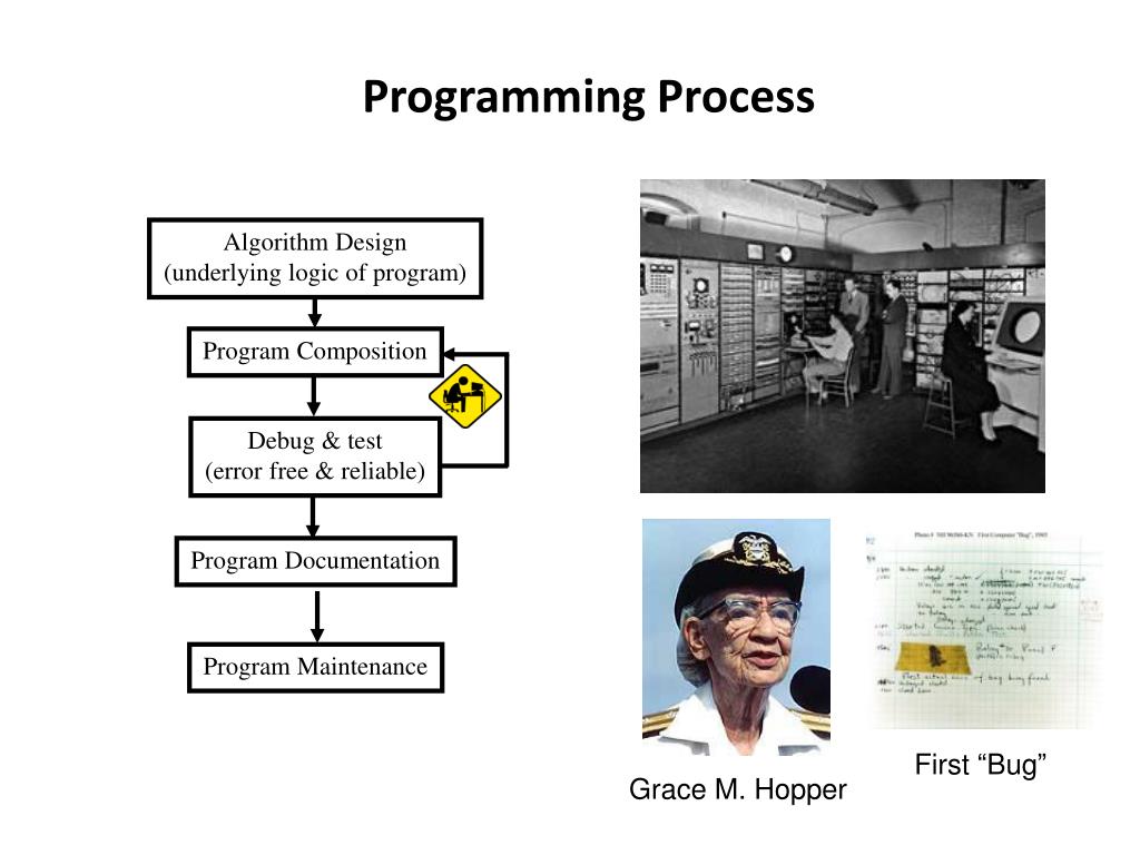 First “Bug” Grace M. Hopper Programming Process Algorithm Design (underlying logic of program) Program Composition Debug & test (error free & reliable) Program Documentation Program Maintenance