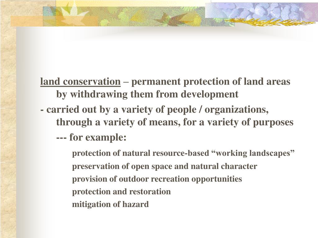 land conservation – permanent protection of land areas by withdrawing them from development - carried out by a variety of people / organizations, through a variety of means, for a variety of purposes --- for example: protection of natural resource-based “working landscapes” preservation of open space and natural character provision of outdoor recreation opportunities protection and restoration mitigation of hazard