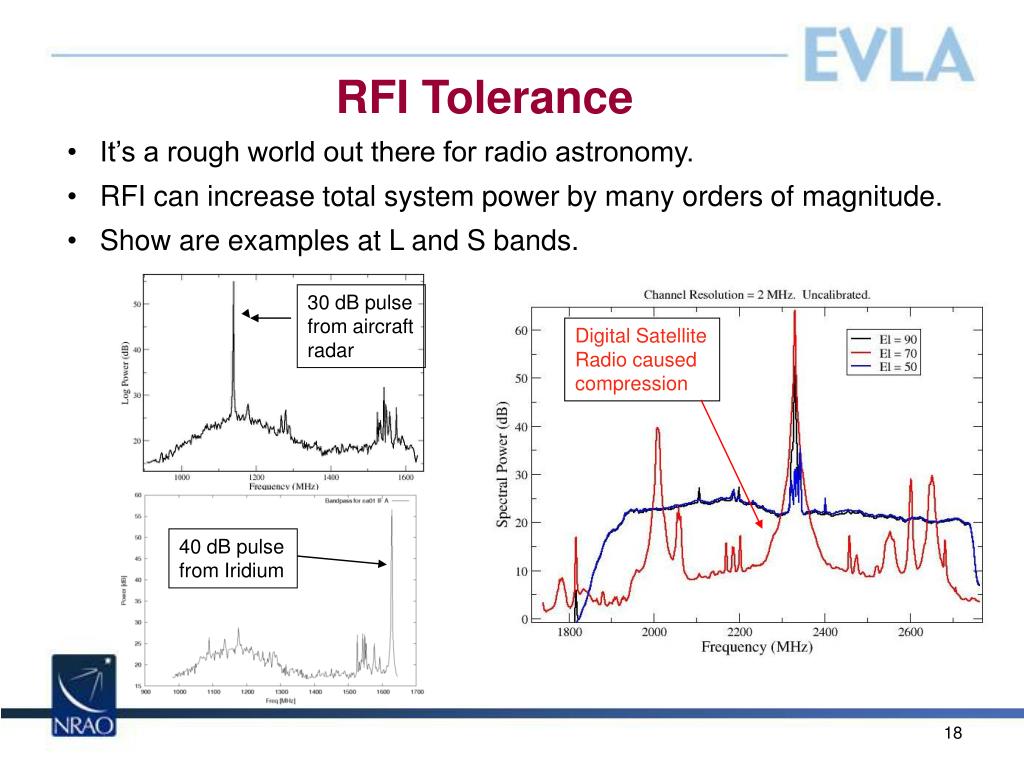 RFI Tolerance • It’s a rough world out there for radio astronomy. • RFI can increase total system power by many orders of magnitude. • Show are examples at L and S bands. 30 dB pulse from aircraft radar Digital Satellite Radio caused compression 40 dB pulse from Iridium