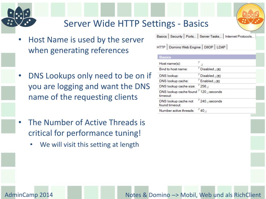 Server Wide HTTP Settings - Basics • Host Name is used by the server when generating references • DNS Lookups only need to be on if you are logging and want the DNS name of the requesting clients • The Number of Active Threads is critical for performance tuning! • We will visit this setting at length