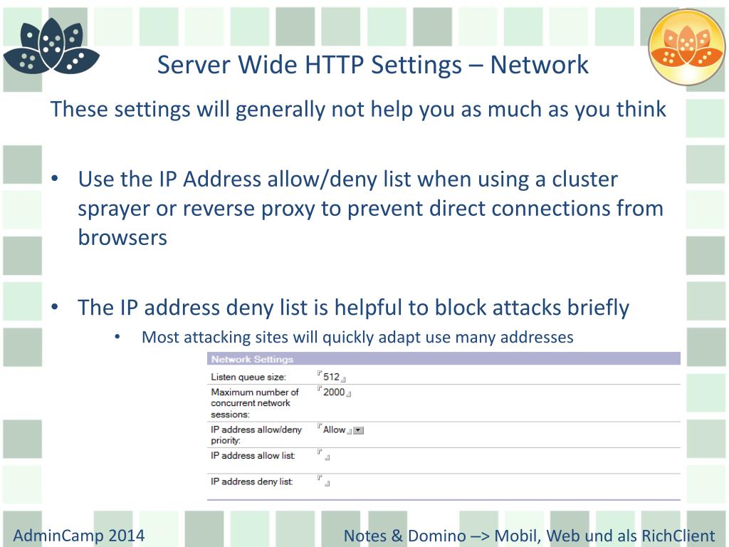 Server Wide HTTP Settings – Network • These settings will generally not help you as much as you think • Use the IP Address allow/deny list when using a cluster sprayer or reverse proxy to prevent direct connections from browsers • The IP address deny list is helpful to block attacks briefly • Most attacking sites will quickly adapt use many addresses
