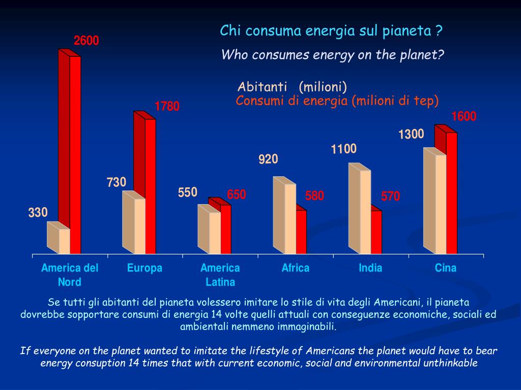 Chi consuma energia sul pianeta ? Who consumes energy on the planet? Abitanti (milioni) Consumi di energia (milioni di tep) Se tutti gli abitanti del pianeta volessero imitare lo stile di vita degli Americani, il pianeta dovrebbe sopportare consumi di energia 14 volte quelli attuali con conseguenze economiche, sociali ed ambientali nemmeno immaginabili. If everyone on the planet wanted to imitate the lifestyle of Americans the planet would have to bear energy consuption 14 times that with current economic, social and environmental unthinkable