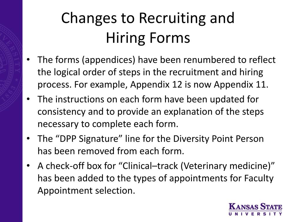 Changes to Recruiting and Hiring Forms • The forms (appendices) have been renumbered to reflect the logical order of steps in the recruitment and hiring process. For example, Appendix 12 is now Appendix 11. • The instructions on each form have been updated for consistency and to provide an explanation of the steps necessary to complete each form. • The “DPP Signature” line for the Diversity Point Person has been removed from each form. • A check-off box for “Clinical–track (Veterinary medicine)” has been added to the types of appointments for Faculty Appointment selection.