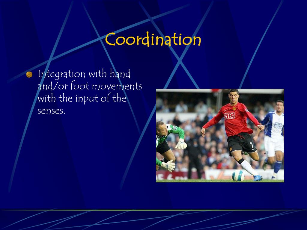 Coordination • Integration with hand and/or foot movements with the input of the senses.