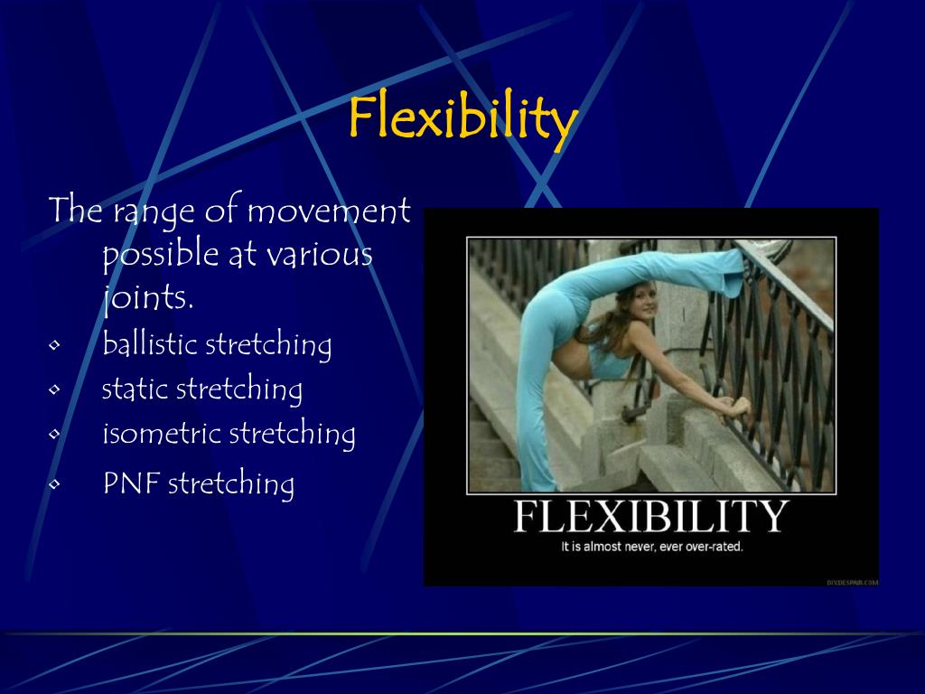 Flexibility The range of movement possible at various joints. • ballistic stretching • static stretching • isometric stretching • PNF stretching