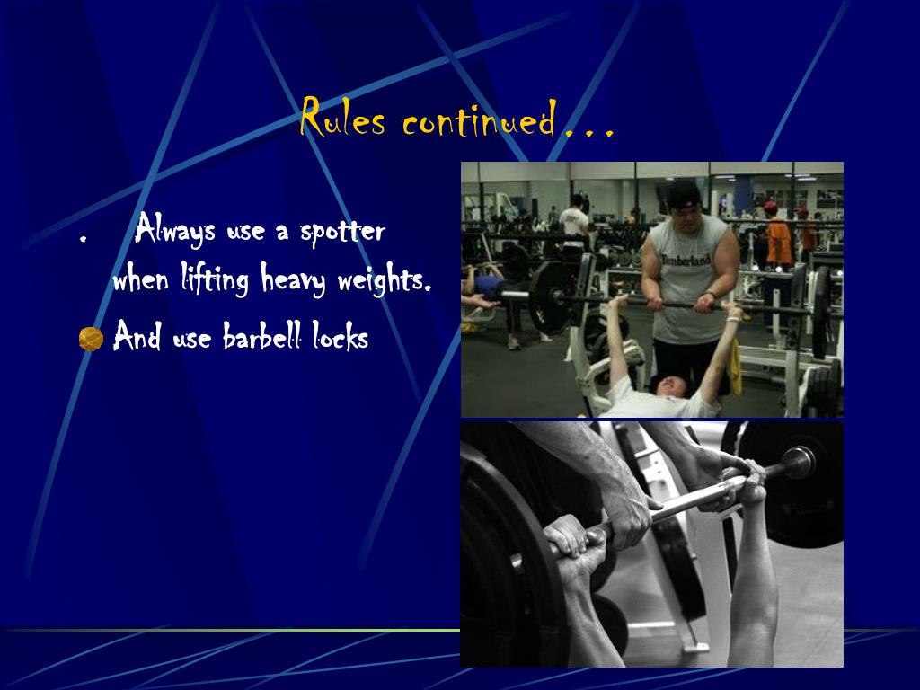 Rules continued… . Always use a spotter when lifting heavy weights. • And use barbell locks