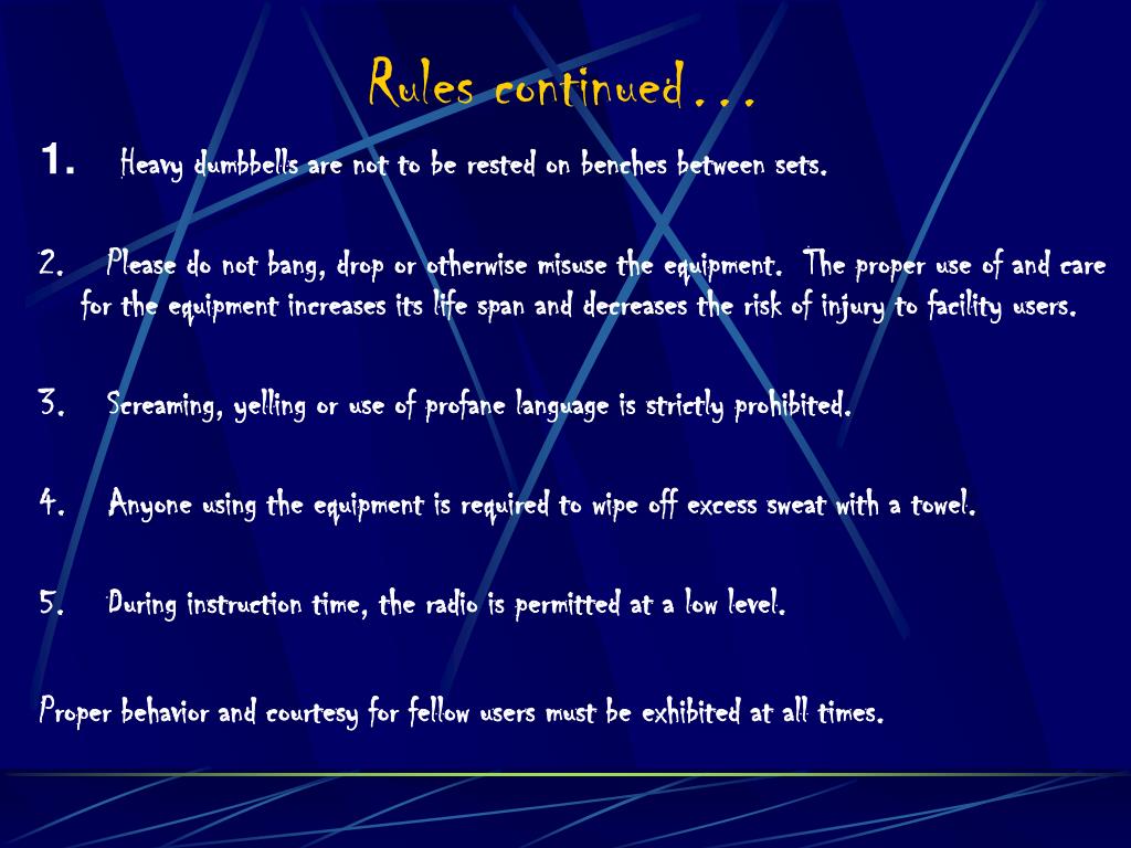Rules continued… 1.Heavy dumbbells are not to be rested on benches between sets. 2. Please do not bang, drop or otherwise misuse the equipment. The proper use of and care for the equipment increases its life span and decreases the risk of injury to facility users. 3. Screaming, yelling or use of profane language is strictly prohibited. 4. Anyone using the equipment is required to wipe off excess sweat with a towel. 5. During instruction time, the radio is permitted at a low level. Proper behavior and courtesy for fellow users must be exhibited at all times.