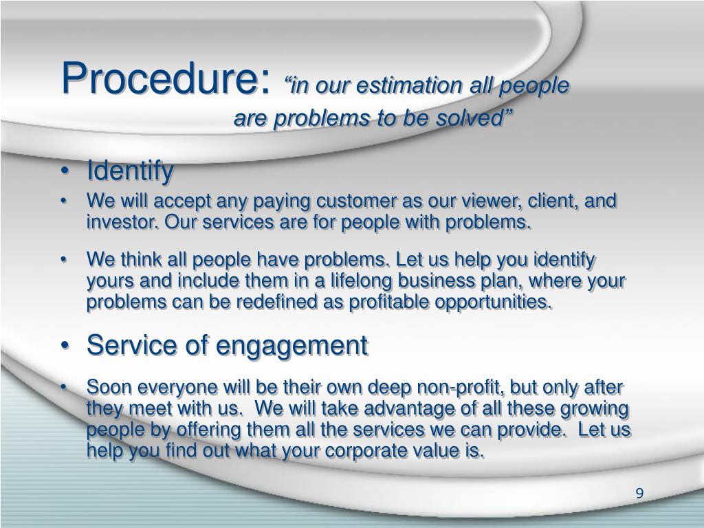 Procedure: “in our estimation all people are problems to be solved” • Identify • We will accept any paying customer as our viewer, client, and investor. Our services are for people with problems. • We think all people have problems. Let us help you identify yours and include them in a lifelong business plan, where your problems can be redefined as profitable opportunities. • Service of engagement • Soon everyone will be their own deep non-profit, but only after they meet with us. We will take advantage of all these growing people by offering them all the services we can provide. Let us help you find out what your corporate value is.