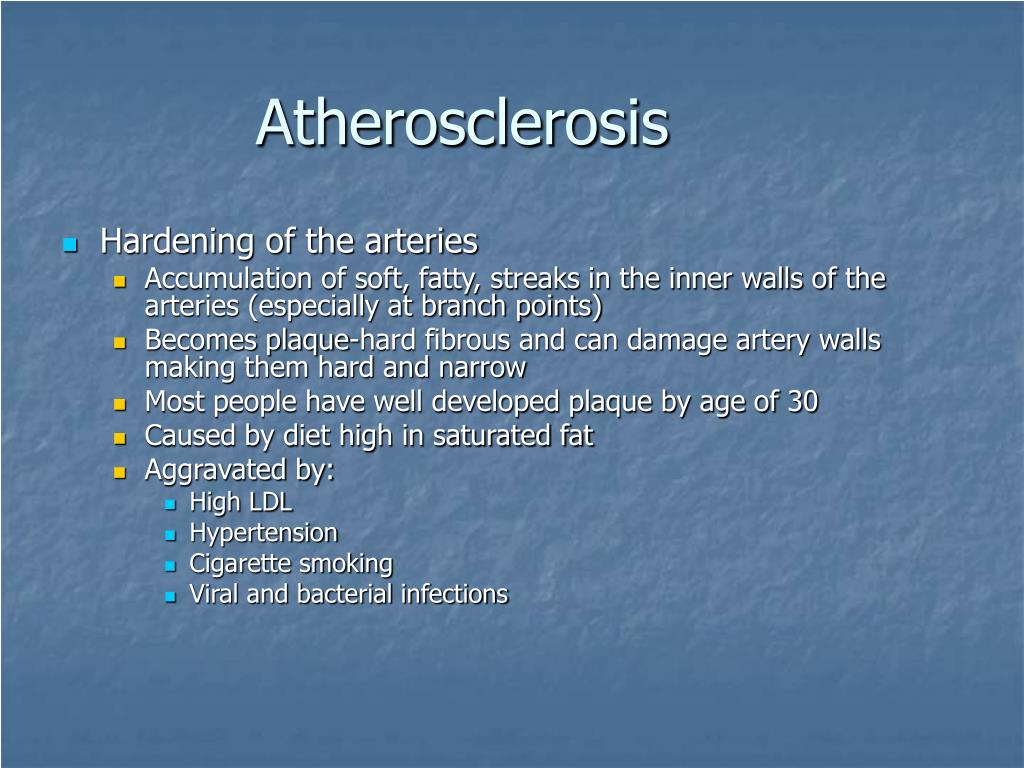 Atherosclerosis • Hardening of the arteries • Accumulation of soft, fatty, streaks in the inner walls of the arteries (especially at branch points) • Becomes plaque-hard fibrous and can damage artery walls making them hard and narrow • Most people have well developed plaque by age of 30 • Caused by diet high in saturated fat • Aggravated by: • High LDL • Hypertension • Cigarette smoking • Viral and bacterial infections