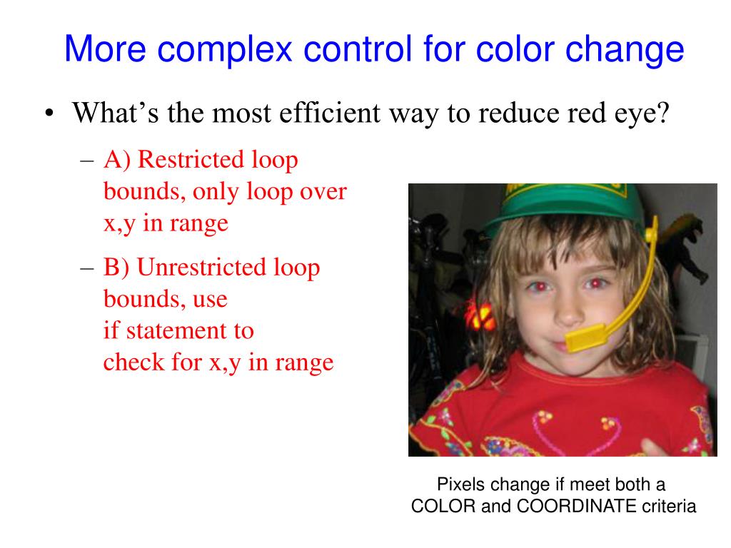 More complex control for color change • What’s the most efficient way to reduce red eye? • A) Restricted loop bounds, only loop overx,y in range • B) Unrestricted loopbounds, useif statement tocheck for x,y in range Pixels change if meet both a COLOR and COORDINATE criteria