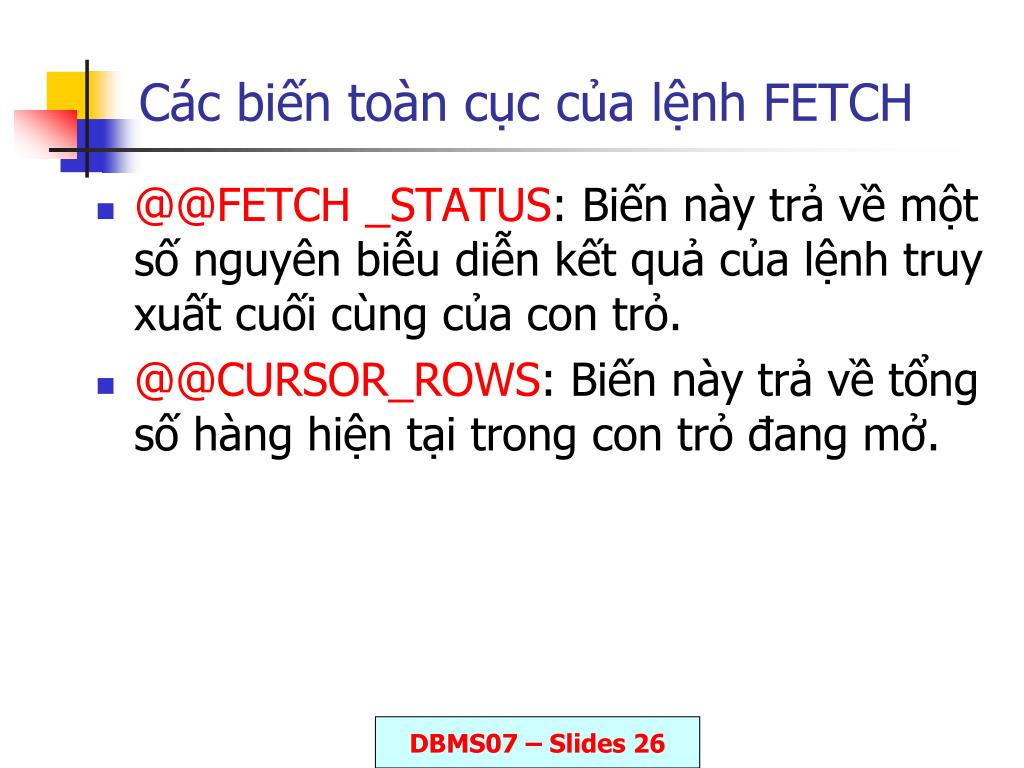 Các biến toàn cục của lệnh FETCH • @@FETCH _STATUS: Biến này trả về một số nguyên biễu diễn kết quả của lệnh truy xuất cuối cùng của con trỏ. • @@CURSOR_ROWS: Biến này trả về tổng số hàng hiện tại trong con trỏ đang mở.