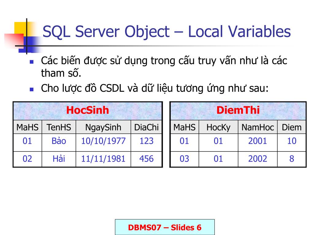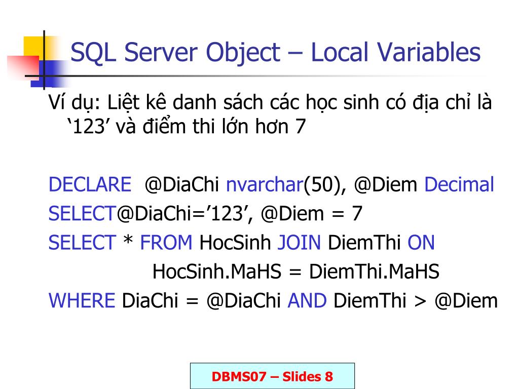 SQL Server Object – Local Variables Ví dụ: Liệt kê danh sách các học sinh có địa chỉ là ‘123’ và điểm thi lớn hơn 7 DECLARE @DiaChi nvarchar(50), @Diem Decimal SELECT@DiaChi=’123’, @Diem = 7 SELECT * FROM HocSinh JOIN DiemThi ON HocSinh.MaHS = DiemThi.MaHS WHERE DiaChi = @DiaChi AND DiemThi > @Diem