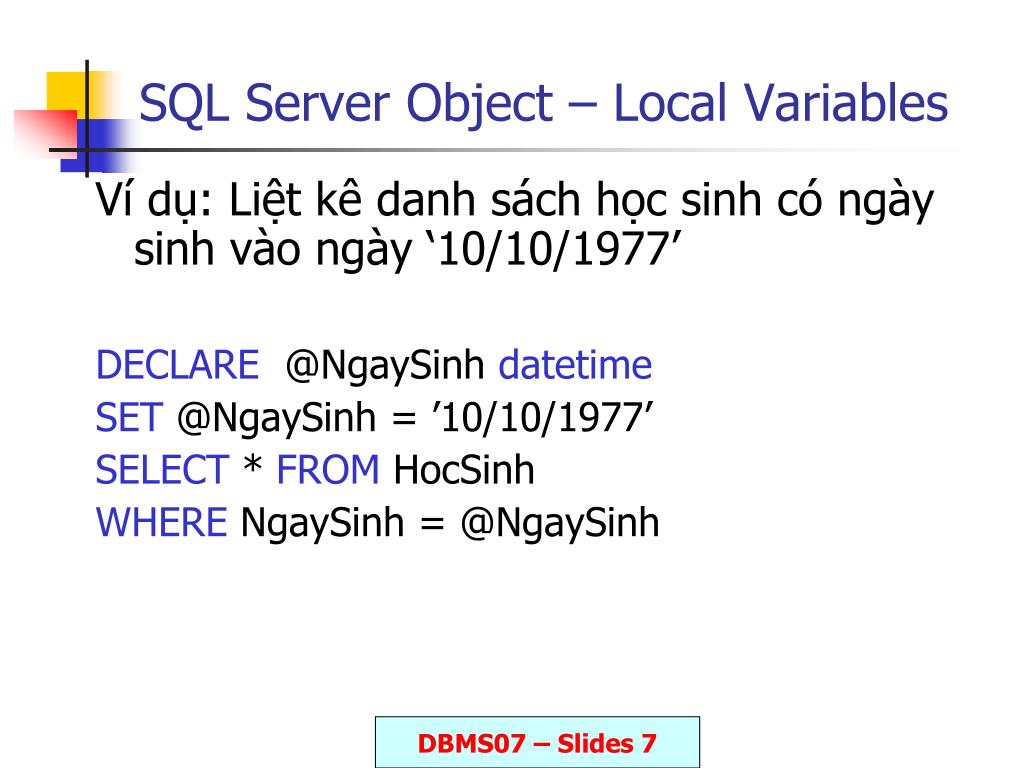 SQL Server Object – Local Variables Ví dụ: Liệt kê danh sách học sinh có ngày sinh vào ngày ‘10/10/1977’ DECLARE @NgaySinh datetime SET @NgaySinh = ’10/10/1977’ SELECT * FROM HocSinh WHERE NgaySinh = @NgaySinh