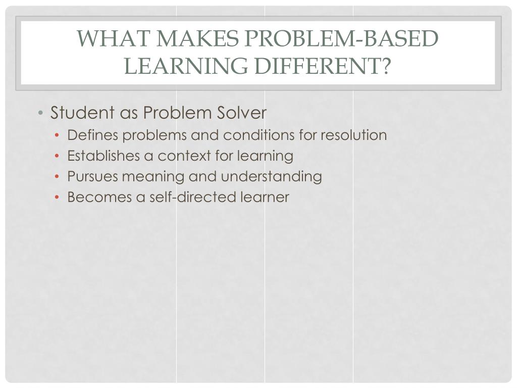 What Makes Problem-Based Learning Different? • Student as Problem Solver • Defines problems and conditions for resolution • Establishes a context for learning • Pursues meaning and understanding • Becomes a self-directed learner