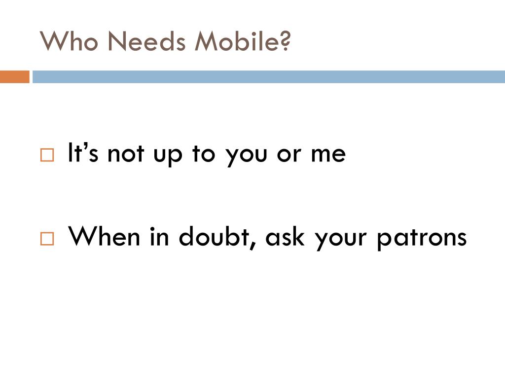 Who Needs Mobile? • It’s not up to you or me • When in doubt, ask your patrons