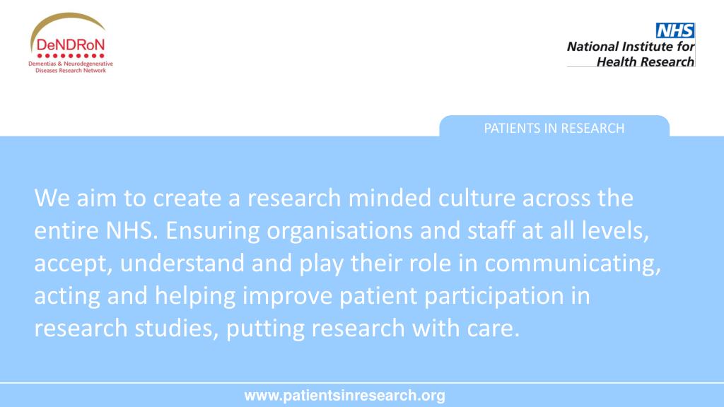 We aim to create a research minded culture across the entire NHS. Ensuring organisations and staff at all levels, accept, understand and play their role in communicating, acting and helping improve patient participation in research studies, putting research with care.
