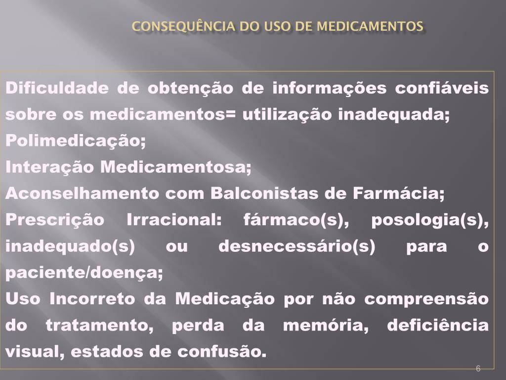 Consequência do uso de medicamentos Dificuldade de obtenção de informações confiáveis sobre os medicamentos= utilização inadequada; Polimedicação; Interação Medicamentosa; Aconselhamento com Balconistas de Farmácia; Prescrição Irracional: fármaco(s), posologia(s), inadequado(s) ou desnecessário(s) para o paciente/doença; Uso Incorreto da Medicação por não compreensão do tratamento, perda da memória, deficiência visual, estados de confusão.