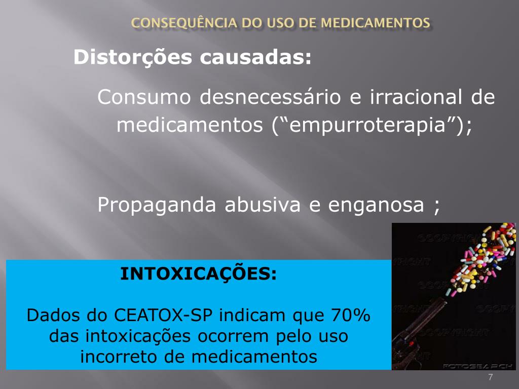 Consequência do uso de medicamentos • Distorções causadas: • Consumo desnecessário e irracional de medicamentos (“empurroterapia”); • Propaganda abusiva e enganosa ; INTOXICAÇÕES: Dados do CEATOX-SP indicam que 70% das intoxicações ocorrem pelo uso incorreto de medicamentos