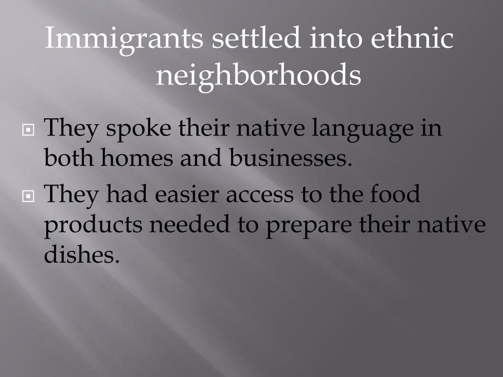 Immigrants settled into ethnic neighborhoods • They spoke their native language in both homes and businesses. • They had easier access to the food products needed to prepare their native dishes.