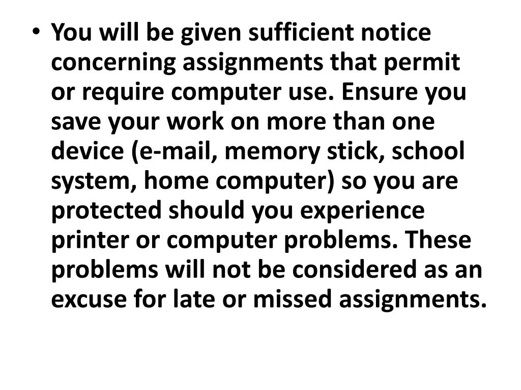 You will be given sufficient notice concerning assignments that permit or require computer use. Ensure you save your work on more than one device (e-mail, memory stick, school system, home computer) so you are protected should you experience printer or computer problems. These problems will not be considered as an excuse for late or missed assignments.