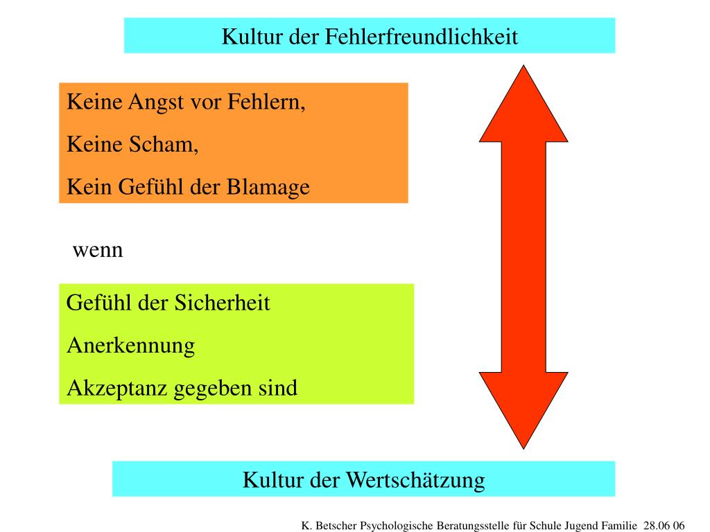 Kultur der Fehlerfreundlichkeit Keine Angst vor Fehlern, Keine Scham, Kein Gefühl der Blamage wenn Gefühl der Sicherheit Anerkennung Akzeptanz gegeben sind Kultur der Wertschätzung K. Betscher Psychologische Beratungsstelle für Schule Jugend Familie 28.06 06