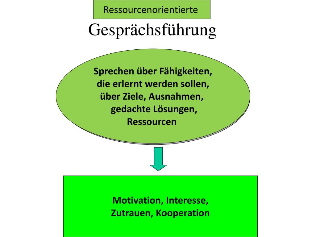 Ressourcenorientierte Sprechen über Fähigkeiten, die erlernt werden sollen, über Ziele, Ausnahmen, gedachte Lösungen, Ressourcen Motivation, Interesse, Zutrauen, Kooperation