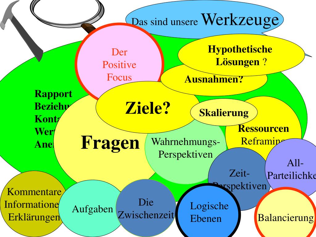 Das sind unsere Werkzeuge Der Positive Focus Rapport Beziehung Kontakt Wertschätzung Anerkennung Hypothetische Lösungen ? Ausnahmen? Ziele? Fragen Ressourcen Reframing Skalierung Wahrnehmungs- Perspektiven All- Parteilichkeit Zeit- Perspektiven Kommentare Informationen Erklärungen Die Zwischenzeit Aufgaben Balancierung Logische Ebenen