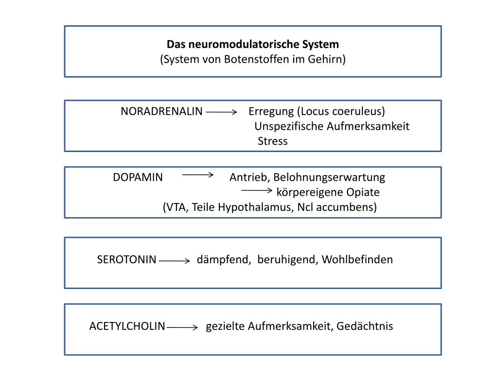 Das neuromodulatorische System (System von Botenstoffen im Gehirn) NORADRENALIN Erregung (Locuscoeruleus) Unspezifische Aufmerksamkeit Stress DOPAMIN Antrieb, Belohnungserwartung körpereigene Opiate (VTA, Teile Hypothalamus, Nclaccumbens) SEROTONIN dämpfend, beruhigend, Wohlbefinden ACETYLCHOLIN gezielte Aufmerksamkeit, Gedächtnis