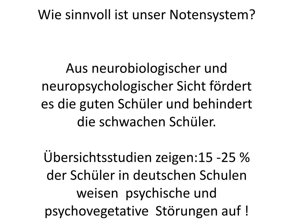Wie sinnvoll ist unser Notensystem? Aus neurobiologischer und neuropsychologischer Sicht fördert es die guten Schüler und behindert die schwachen Schüler. Übersichtsstudien zeigen:15 -25 % der Schüler in deutschen Schulen weisen psychische und psychovegetative Störungen auf !