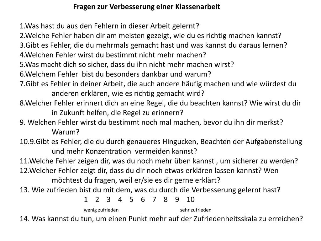 Fragen zur Verbesserung einer Klassenarbeit 1.Was hast du aus den Fehlern in dieser Arbeit gelernt? 2.Welche Fehler haben dir am meisten gezeigt, wie du es richtig machen kannst? 3.Gibt es Fehler, die du mehrmals gemacht hast und was kannst du daraus lernen? 4.Welchen Fehler wirst du bestimmt nicht mehr machen? 5.Was macht dich so sicher, dass du ihn nicht mehr machen wirst? 6.Welchem Fehler bist du besonders dankbar und warum? 7.Gibt es Fehler in deiner Arbeit, die auch andere häufig machen und wie würdest du anderen erklären, wie es richtig gemacht wird? 8.Welcher Fehler erinnert dich an eine Regel, die du beachten kannst? Wie wirst du dir in Zukunft helfen, die Regel zu erinnern? 9. Welchen Fehler wirst du bestimmt noch mal machen, bevor du ihn dir merkst? Warum? 10.9.Gibt es Fehler, die du durch genaueres Hingucken, Beachten der Aufgabenstellung und mehr Konzentration vermeiden kannst? 11.Welche Fehler zeigen dir, was du noch mehr üben kannst , um sicherer zu werden? 12.Welcher Fehler zeigt dir, dass du dir noch etwas erklären lassen kannst? Wen möchtest du fragen, weil er/sie es dir gerne erklärt? 13. Wie zufrieden bist du mit dem, was du durch die Verbesserung gelernt hast? 1 2 3 4 5 6 7 8 9 10 wenig zufrieden sehr zufrieden 14. Was kannst du tun, um einen Punkt mehr auf der Zufriedenheitsskala zu erreichen?