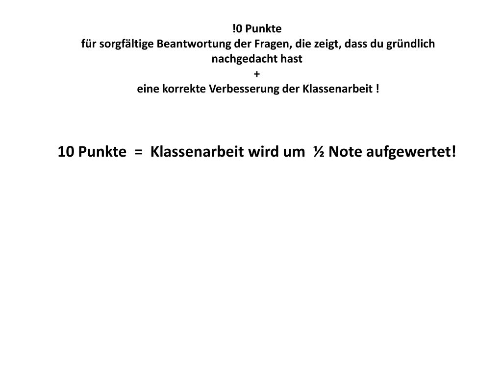 !0 Punkte für sorgfältige Beantwortung der Fragen, die zeigt, dass du gründlich nachgedacht hast + eine korrekte Verbesserung der Klassenarbeit ! 10 Punkte = Klassenarbeit wird um ½ Note aufgewertet!
