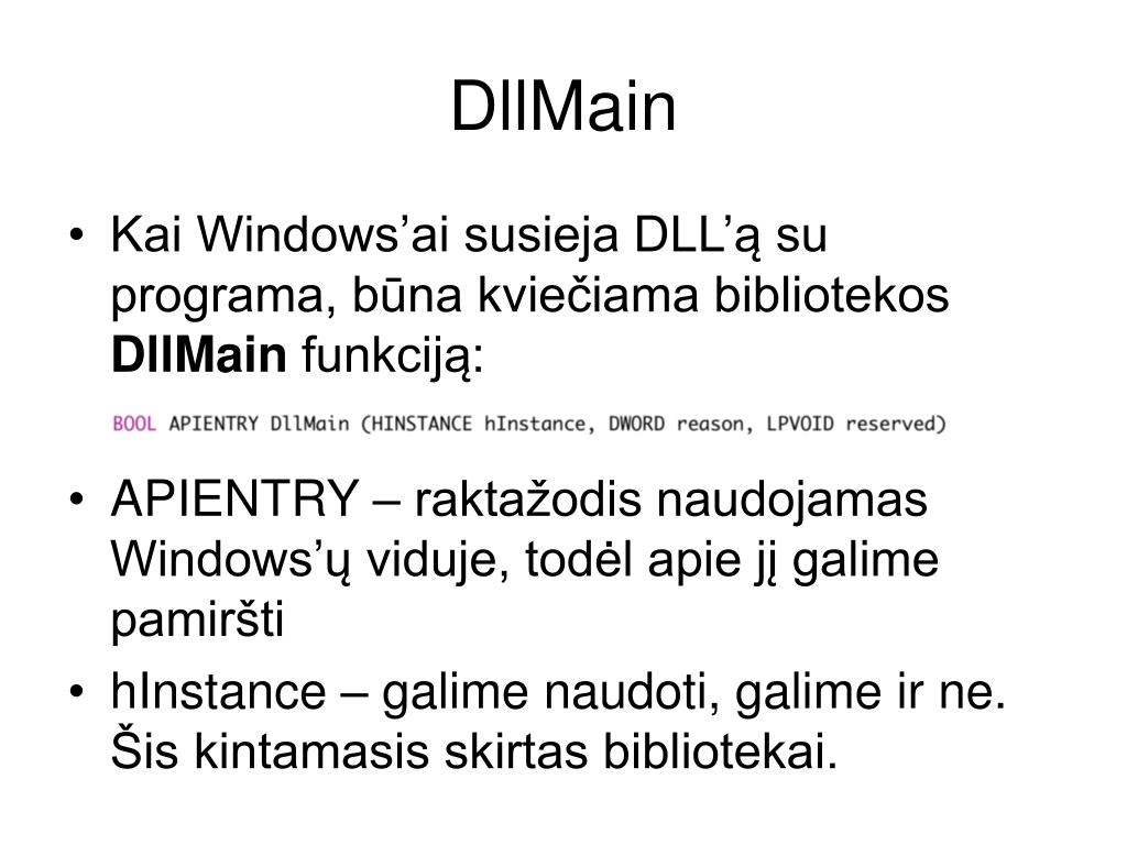 DllMain • Kai Windows’ai susieja DLL’ą su programa, būna kviečiama bibliotekos DllMain funkciją: • APIENTRY – raktažodis naudojamas Windows’ų viduje, todėl apie jį galime pamiršti • hInstance – galime naudoti, galime ir ne. Šis kintamasis skirtas bibliotekai.
