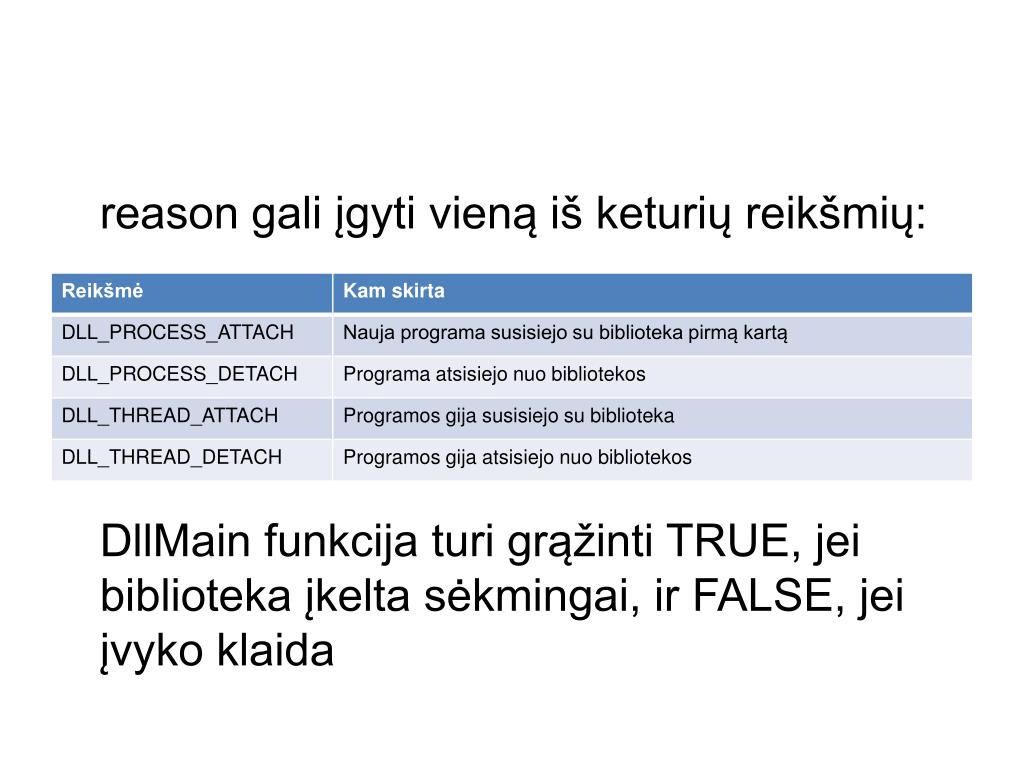 reason gali įgyti vieną iš keturių reikšmių: DllMain funkcija turi grąžinti TRUE, jei biblioteka įkelta sėkmingai, ir FALSE, jei įvyko klaida