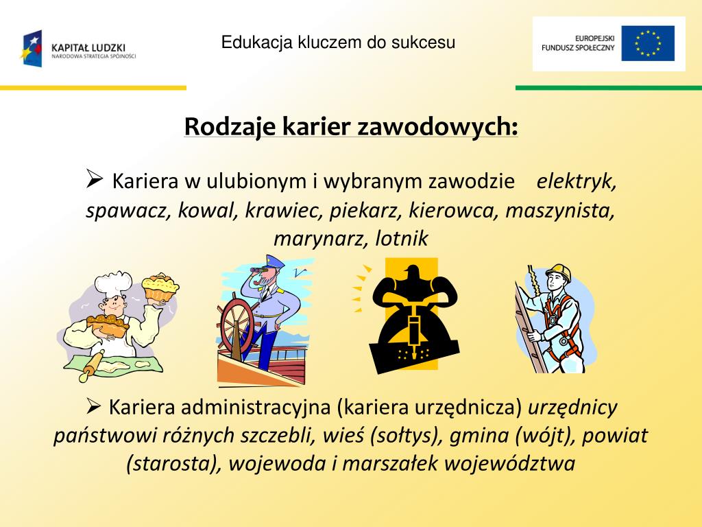 Edukacja kluczem do sukcesu Rodzaje karier zawodowych: • Kariera w ulubionym i wybranym zawodzie elektryk, spawacz, kowal, krawiec, piekarz, kierowca, maszynista, marynarz, lotnik • Kariera administracyjna (kariera urzędnicza) urzędnicy państwowi różnych szczebli, wieś (sołtys), gmina (wójt), powiat (starosta), wojewoda i marszałek województwa