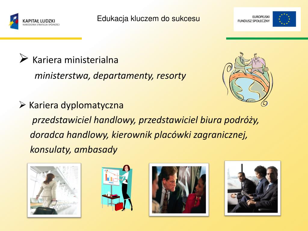 Edukacja kluczem do sukcesu • Kariera ministerialna ministerstwa, departamenty, resorty • Kariera dyplomatyczna przedstawiciel handlowy, przedstawiciel biura podróży, doradca handlowy, kierownik placówki zagranicznej, konsulaty, ambasady