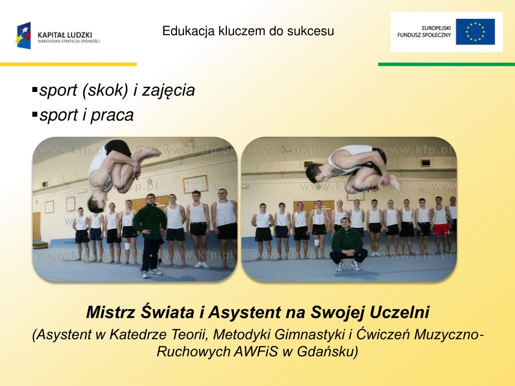 Edukacja kluczem do sukcesu • sport (skok) i zajęcia • sport i praca Mistrz Świata i Asystent na Swojej Uczelni (Asystent w Katedrze Teorii, Metodyki Gimnastyki i Ćwiczeń Muzyczno-Ruchowych AWFiS w Gdańsku)