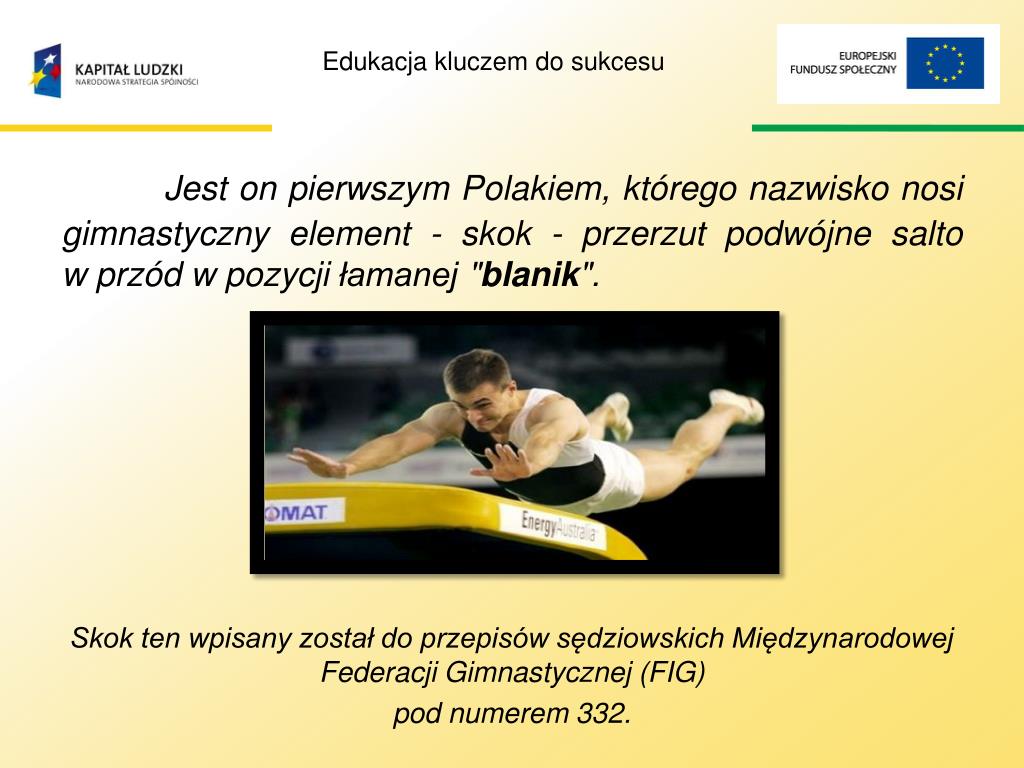Edukacja kluczem do sukcesu Jest on pierwszym Polakiem, którego nazwisko nosi gimnastyczny element - skok - przerzut podwójne salto w przód w pozycji łamanej "blanik". Skok ten wpisany został do przepisów sędziowskich Międzynarodowej Federacji Gimnastycznej (FIG) pod numerem 332.