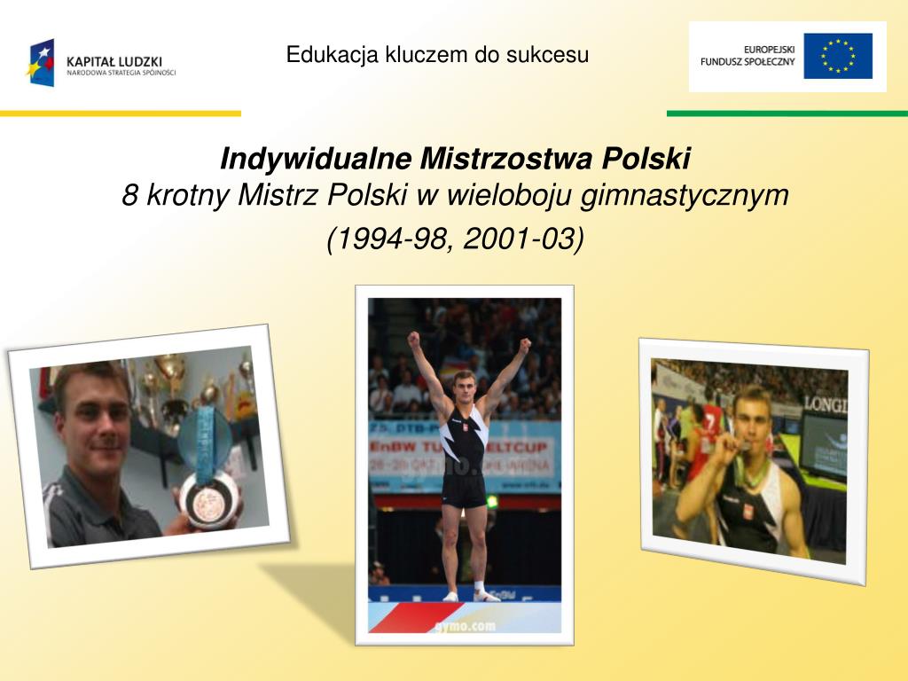 Edukacja kluczem do sukcesu Indywidualne Mistrzostwa Polski8 krotny Mistrz Polski w wieloboju gimnastycznym (1994-98, 2001-03)