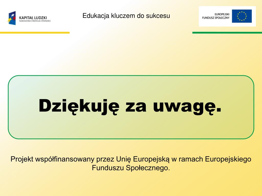 Edukacja kluczem do sukcesu Dziękuję za uwagę. Projekt współfinansowany przez Unię Europejską w ramach Europejskiego Funduszu Społecznego.