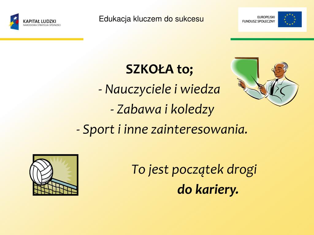 Edukacja kluczem do sukcesu SZKOŁA to; - Nauczyciele i wiedza - Zabawa i koledzy - Sport i inne zainteresowania. To jest początek drogi do kariery.