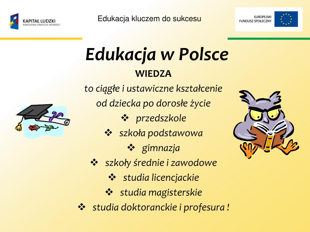 Edukacja kluczem do sukcesu Edukacja w Polsce WIEDZA to ciągłe i ustawiczne kształcenie od dziecka po dorosłe życie • przedszkole • szkoła podstawowa • gimnazja • szkoły średnie i zawodowe • studia licencjackie • studia magisterskie • studia doktoranckie i profesura !