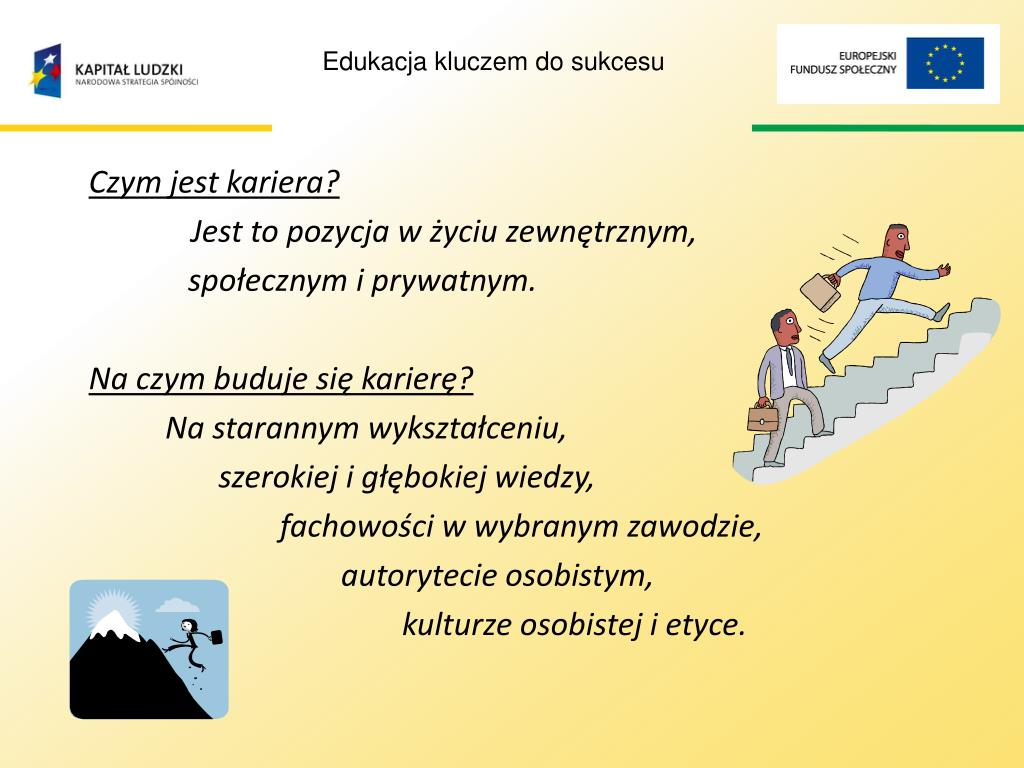 Edukacja kluczem do sukcesu Czym jest kariera? Jest to pozycja w życiu zewnętrznym, społecznym i prywatnym. Na czym buduje się karierę? Na starannym wykształceniu, szerokiej i głębokiej wiedzy, fachowości w wybranym zawodzie, autorytecie osobistym, kulturze osobistej i etyce.