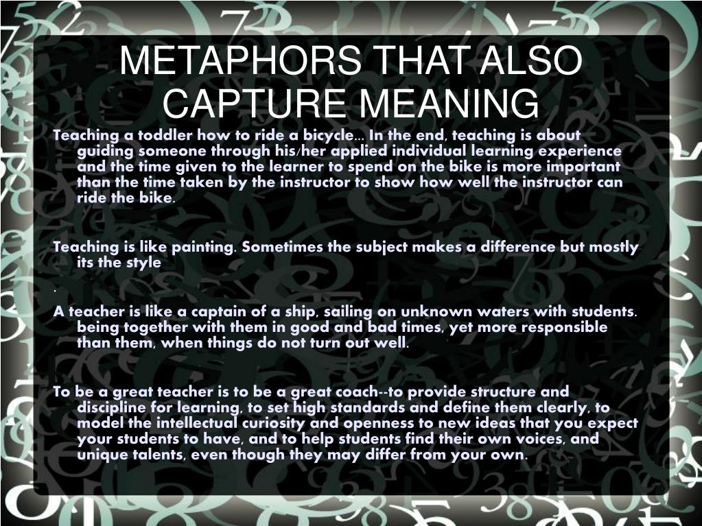 METAPHORS THAT ALSO CAPTURE MEANING Teaching a toddler how to ride a bicycle... In the end, teaching is about guiding someone through his/her applied individual learning experience and the time given to the learner to spend on the bike is more important than the time taken by the instructor to show how well the instructor can ride the bike. Teaching is like painting. Sometimes the subject makes a difference but mostly its the style . A teacher is like a captain of a ship, sailing on unknown waters with students. being together with them in good and bad times, yet more responsible than them, when things do not turn out well. To be a great teacher is to be a great coach--to provide structure and discipline for learning, to set high standards and define them clearly, to model the intellectual curiosity and openness to new ideas that you expect your students to have, and to help students find their own voices, and unique talents, even though they may differ from your own.