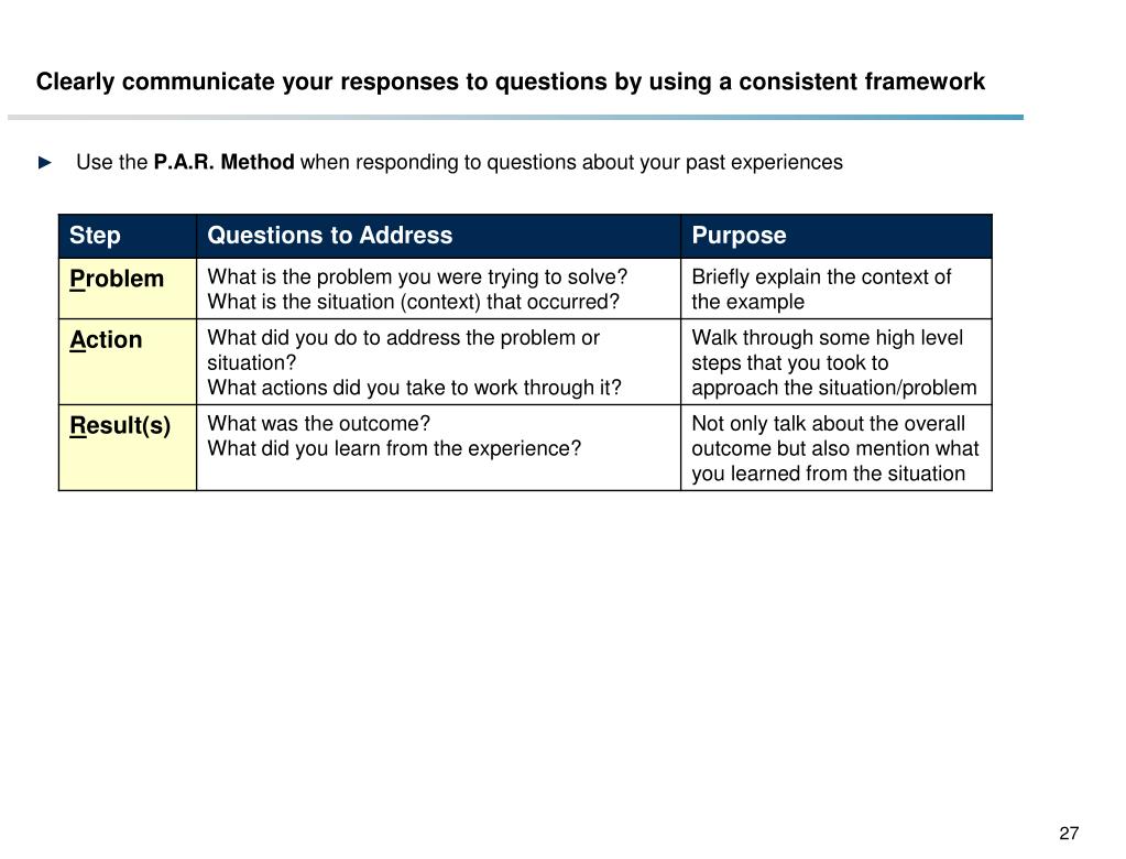 Clearly communicate your responses to questions by using a consistent framework • Use the P.A.R. Method when responding to questions about your past experiences